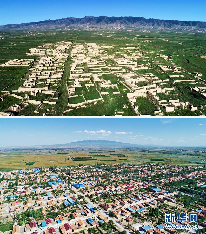 拼版照片:上图为经过多年的生态修复,宁夏吴忠市红寺堡区新庄集乡移民旧址已逐渐被绿色覆盖;下图为戈壁荒滩上建起的红寺堡移民新村(2018年9月8日摄,无人机照片)。 新华社记者 王鹏 摄