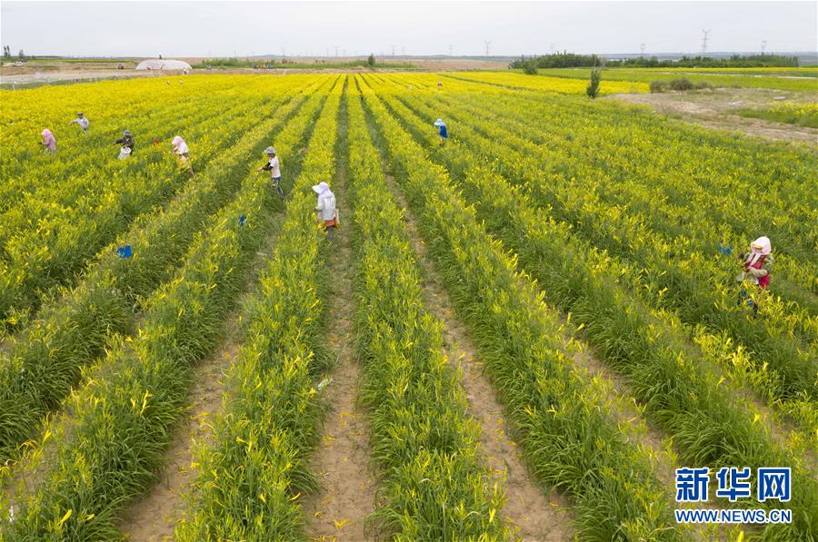 村民在宁夏红寺堡区柳泉乡柳泉村采摘黄花菜(7月11日摄,无人机照片)。 新华社记者 杨植森 摄