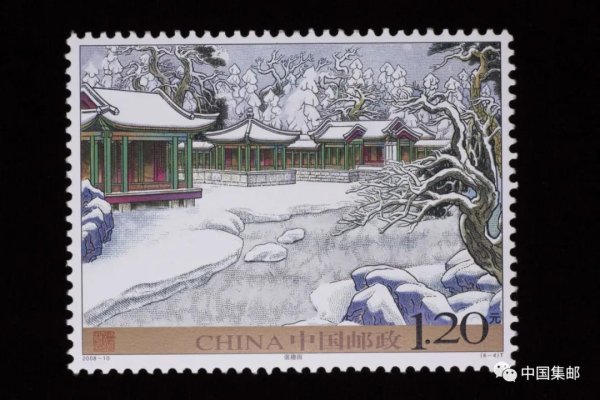 不同于前两枚邮票作为北京名胜风景之一出现,2008年颐和园以整套邮票形式登上方寸舞台,由工笔画大师萧玉田采用传统工笔重彩画法匠心打造,选用天然矿石颜料、岩彩和云母等颜色绘制,并结合一些水彩画的方法,敷色在厚重沉稳中透出雍容华贵之气,也不失墨彩酣畅淋漓、透明纯净的效果,表现出皇家园林的富贵与清雅。2008-10《颐和园》邮票一套6枚,小型张1枚,由河南省邮电印刷厂以胶雕套印形式呈现,其中佛香阁以更加突出的主体、更为细腻的细节描绘,占据了小型张的“C位”。
