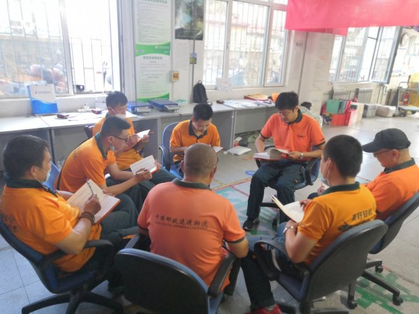 ▲ 青岛山东路揽投部文明号号长孙琛,按照活动周工作安排,组织员工一起学习“习近平谈治国理政”。