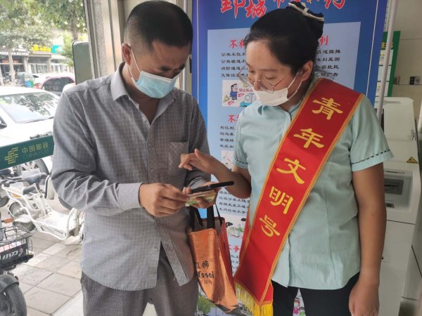东营市邮政分公司结合团市委“与国旗同框 向祖国告白”活动要求,组织全市青年文明号集体和广大青年员工身体力行弘扬职业文明、传播社会正能量。一是亮身份、明承诺。在大堂、柜面、客户经理等岗位设立“青年文明号”服务岗,佩戴统一胸牌卡,高标准规范服务。二是做志愿、明责任。该分公司东营区各网点结合实际情况设立了“补给站”,为辛苦奔波的外卖小哥、环卫工人提供休息场所和饮用水,以实际行动承担起“青年文明号”的社会责任。
