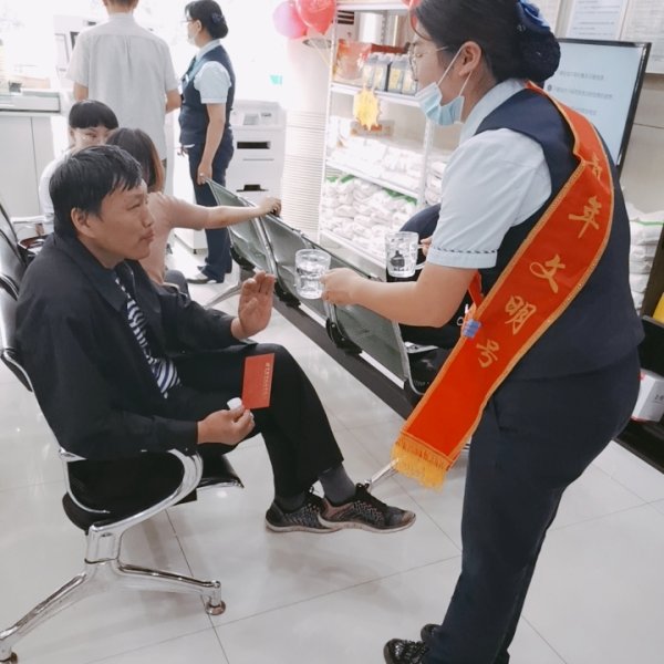 ▲ 青云桥邮政支局员工为等待办理业务的客户倒一杯热水、说一句暖心问候,提高客户用邮体验,以实际行动“亮身份、亮形象、亮承诺”。