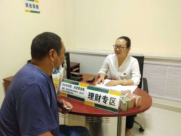 ▲ 惠民中心厅支局员工为群众讲解金融业务知识,提供业务咨询指导,征询群众意见建议。