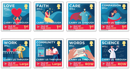 5月,包括中国在内的多国抗疫主题邮票纷纷面世,如马恩岛、摩洛哥、阿联酋、乌拉圭、新西兰、乌克兰等,在此选取部分介绍,不一一赘述。马恩岛邮政于5月4日发行《共克时艰》新冠主题邮票,一套八枚,图案表现了民众和一线人员积极合作、团结一致、共克时艰的斗志,分别表现8个主题:爱心、信念、关爱、同情、爱岗、社区、话语、科研,此次发行获得的部分收入捐赠给马恩岛团结基金会。