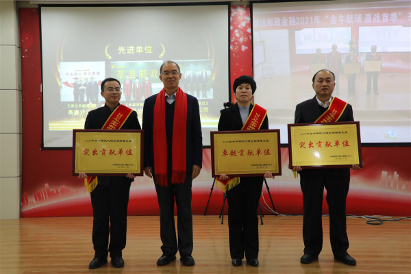 该分公司对原始总量过亿元“突出贡献”奖、原始总量过亿元“卓越贡献”奖、2020年金融业务发展先进县区分公司进行了表彰。会上宣贯了首季开门红活动方案,全市邮政8个军团的负责人分别上台摘标并宣誓信心。支局经理代表、县公司负责人代表、市公司金融业务部、市公司领导分别作表态发言。