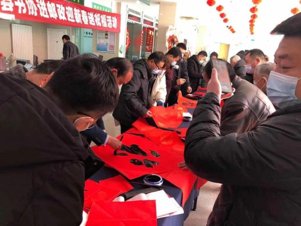 为提升客户用邮体验,新春来临之际,微山县邮政分公司携手书法家协会在荷都支局开展“迎新春、写对联、送祝福”活动。 活动现场,书法家们挥毫泼墨,一幅幅精美的春联,一个个端庄的“福”字瞬间呈现,一句句喜庆吉祥的新春祝福跃然纸上,引得现场客户争相领取。同时,支局理财团队积极为客户介绍邮政产品及活动,和客户进行深入的沟通、交流,现场气氛活跃,活动得到了到场客户的高度认可。
