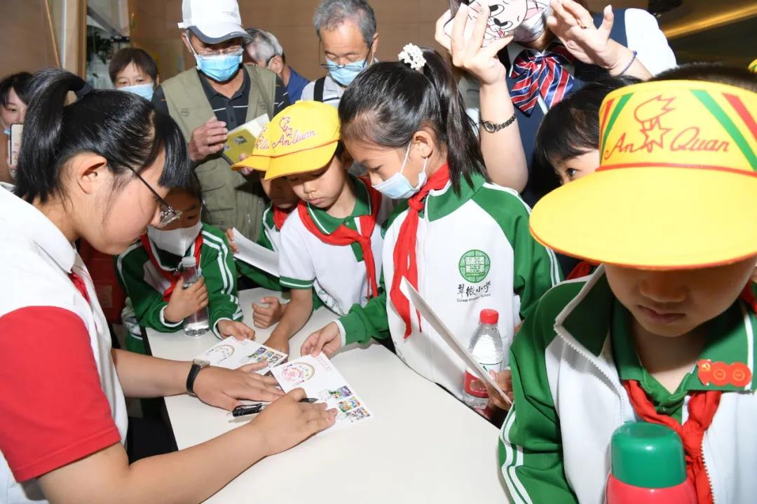花儿向阳,童心向党,在高昂奋进的童声合唱《我和我的祖国》中,颁奖和邮票首发活动圆满落下帷幕。随后,出席活动的嘉宾现场在《儿童画作品选》特种邮票首日封上签名,并投递到主题邮局邮筒中,为部分获奖小朋友们寄出了一份饱含特殊意义的节日礼物。杨晓芒等3位小作者在主题邮局分别为小朋友们签名,鼓励他们用自己创作的邮票作品向建党百年献礼、向伟大时代致敬!