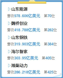 山东能源集团有限公司以营收978.606亿美元在2021《财富》世界500强榜单上位列第70位,居山东上榜企业第一,相比去年上升225位。山东魏桥创业集团有限公司位列第282位,营收418.788亿美元;山东钢铁集团有限公司位列第384位,营收319.903亿美元;海尔智家股份有限公司位列第405位,营收303.95亿美元;潍柴动力股份有限公司今年首次上榜,营业收入286.218亿美元,位列第425位。