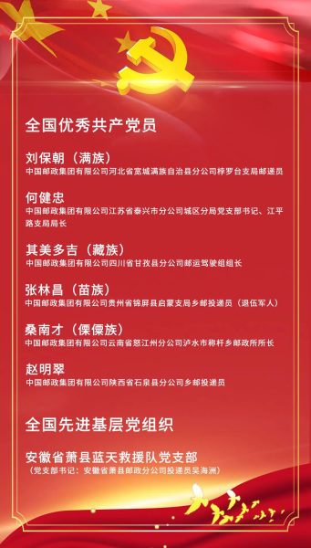 在庆祝中国共产党成立100周年之际,党中央表彰了“全国优秀共产党员”400名、“全国优秀党务工作者”300名、“全国先进基层党组织”499个。邮政集团刘保朝等7名同志荣获“全国优秀共产党员”称号,安徽省萧县邮政分公司投递员吴海洲同志以萧县蓝天救援队党支部书记身份荣获“全国先进基层党组织”表彰。
