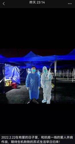 朋友圈里,他这样记录道:“2022.2.22在有爱的日子里,和抗疫一线的爱人并肩作战,期待生机勃勃的苏式生活早日归来!”