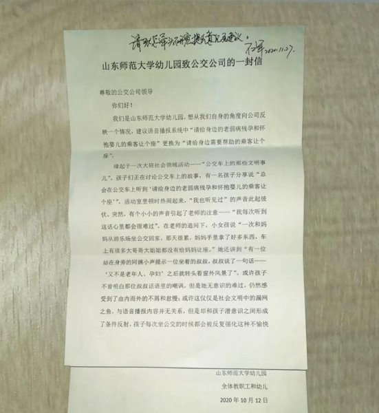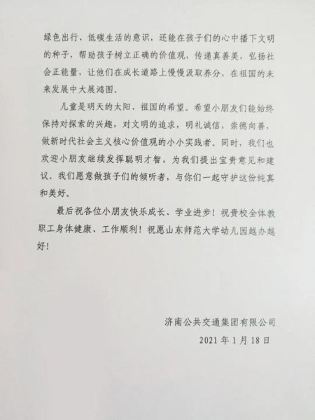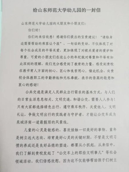 “叔叔阿姨,谢谢你们!”1月15日,山东师范大学幼儿园向济南公交公司发出了第二封信,表达感谢之情。