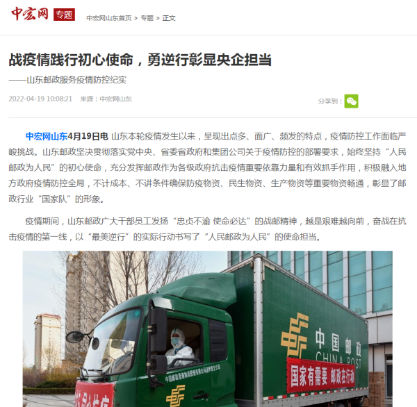 中宏网山东4月19日报道山东邮政“战疫情践行初心使命,勇逆行彰显央企担当”