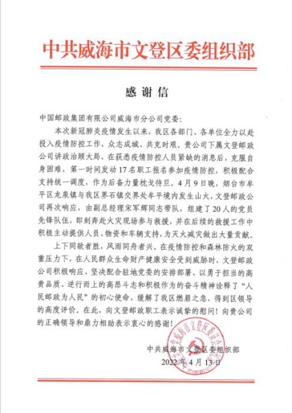 威海文登分公司组建志愿者队伍和党员先锋队参与疫情期间抗疫救灾,当地区委组织部来信致谢。