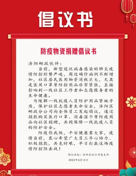 济南济阳区分公司向全区邮政发起“疫情捐助送温情”捐款倡议,104名员工共捐献医用口罩5700枚,消毒湿巾500包,抗疫帐篷2顶。