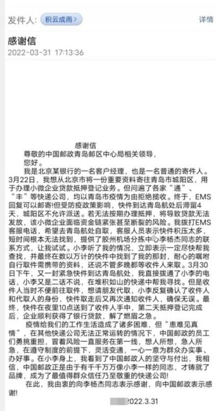 “疫情给我们的工作生活造成了诸多困难,但患难见真情,在其他快递公司无法正常运转的情况下,中国邮政的员工们勇挑重担,冒着风险一直服务在第一线,想人所想,急人所急,一心一意为群众办实事办好事”。3月31日,青岛邮区中心负责人电子邮箱收到一封感谢信,向邮区中心的李杨杰及青岛邮政表示感谢。客户刘女士表示,“在小李身上,我看到了中国邮政人的坚守与付出,我相信,中国邮政正是由于有千千万万像小李一样的同志,才铸就了品牌,成为了最值得群众信任乃至敬重的快递公司!在此,由衷向李杨杰同志表示感谢,向中国邮政表示感谢!”
