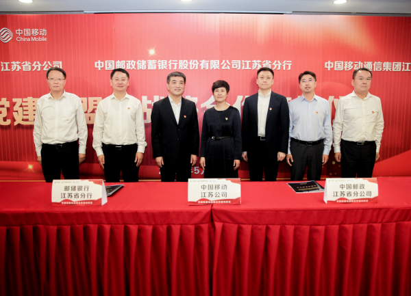 5月26日下午,中国邮政江苏省分公司、邮储银行江苏省分行与中国移动江苏有限公司在南京举行党建联盟和战略合作签约仪式。省邮政分公司党委书记、总经理陈智泉,中国移动江苏有限公司党委书记、董事长、总经理周毅,邮储银行江苏省分行党委书记、行长吴祖讲出席签约仪式并分别致辞。