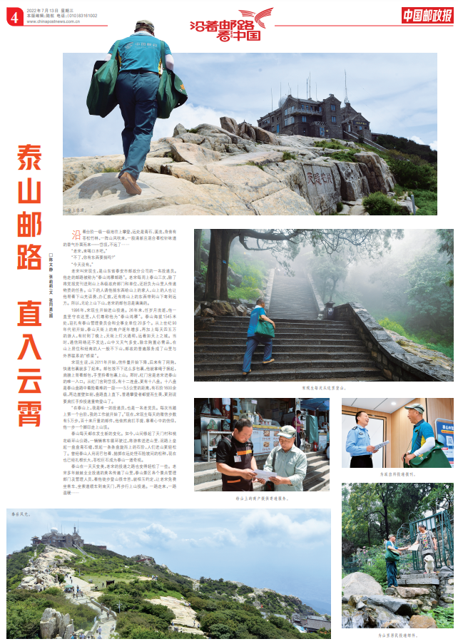 “在泰山上,我是唯一的投递员,也是一名老党员,踏上第一个台阶,我的工作开始了。”每天5万的微信步量,冬天都能拧出汗水的毛巾,平均40多斤的报刊杂志,邮件多的时候百十来斤,他也是肩扛手提,靠着双脚,靠着心中信仰,一步一个脚印走上山顶。