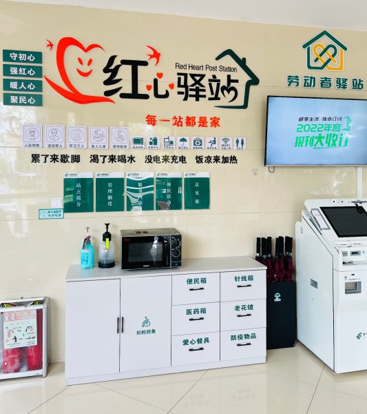 创建“户外劳动者驿站”,主要是为广大从事户外作业的劳动者送去生活上的方便和关爱。驿站内配备微波炉、空调、饮水机、医药箱、针线盒等基本物品,还配齐了消毒液、口罩、洗手液等防疫物资,通过对广大户外劳动者的关心和爱护,在全社会营造尊重关爱户外劳动者的良好氛围。