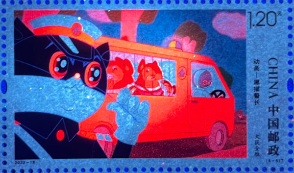 《黑猫警长》是我国第一部科普动画系列片,讲述了机智、勇敢、帅气的黑猫警长率领警士痛歼搬仓鼠,侦破螳螂案,消灭“一只耳”等一个又一个危害森林安全的案件,令森林中的各种动物过上安枕无忧日子的故事,深受孩子们的喜爱,成为八九十年代少年儿童的美好记忆。 该套邮票由尚盈设计,表现了动画中制服强盗、捉捕恶鹰、保卫家园、并肩作战、大获全胜5个故事情节,突出展现了黑猫警长英姿飒爽、智勇双全的经典动画形象。整体设计延续动画系列邮票的设计形式,并采用蒙太奇的表现手法,将不同的场景和镜头进行重组、拼接和色彩强化,画面主体突出、色彩鲜明、动态丰富、场景连贯,在静止的邮票中展现出一幕幕经典场景,重现经典动画形象。 该套邮票采用影写版工艺印制,色彩明快、饱和度高,并且同时采用了金、银两种特种金属墨,金色的文字使得邮票面值和铭记光彩闪耀,银色的轮廓线条为黑猫警长的形象赋予了金属光泽,更加凸显了黑猫警长的“主角光环”。