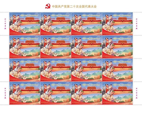 中国邮政定于2022年10月16日发行《中国共产党第二十次全国代表大会》纪念邮票一套2枚,小型张1枚。邮票第一图名称为“奋进新征程”,第二图名称为“建功新时代”,小型张图案名称为“庆祝中国共产党第二十次全国代表大会胜利召开”。全套邮票面值8.40元。邮票计划发行数量为1390万套,小型张计划发行数量790万枚。