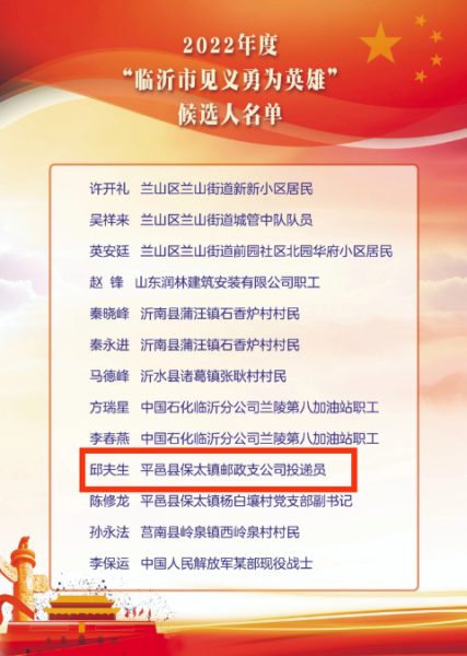 邱夫生,男,1993年6月生,平邑县保太镇邮政支公司投递员。
