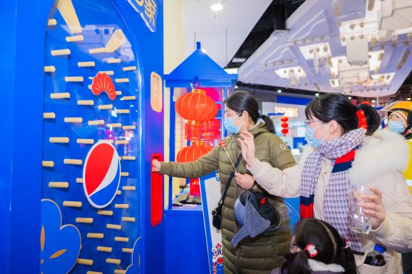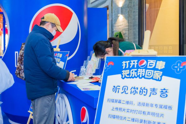 现场分为舞台表演、非遗手作和互动体验三大区域。市民可以欣赏精彩的单人舞龙;观看艺术糖画、彩陶泥人等非遗技艺;参与活力弹球机、DIY激光刻罐、逗趣小丑等互动体验。新年邮局作为互动体验区的核心,结合百事品牌文化,设置了“把乐说出来”“把乐寄出去”和“把乐带回家”三大板块,分别对应有声明信片制作、新年明信片寄递以及兔年生肖邮品销售三大内容。
