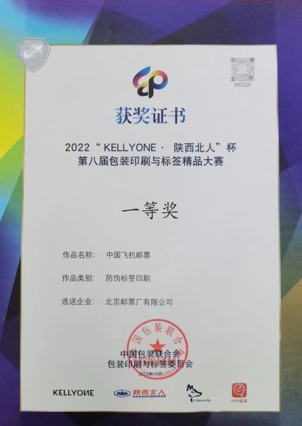 在中国包装联合会主办的2022第八届中国包装印刷与标签作品大奖赛中,我公司选送的《中国飞机(三)》邮票荣获一等奖。