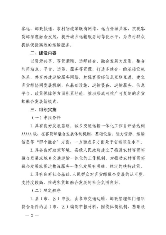 2.市级推荐。各市交通运输、邮政管理部门应对申报材料提 出审核意见,优先推荐在农村物流服务品牌建设和“快递进村” 工作成绩突出的县(市、区),并将推荐理由及样板县建设工作方案报省交通运输厅。