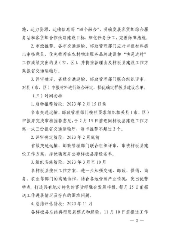 根据《山东省人民政府关于印发 2023 年“稳中向好、进中提质”政策清单(第一批)的通知》(鲁政发〔2022〕18 号),2023年省交通运输厅、省财政厅、省邮政管理局联合开展第三批农村客货邮融合发展样板县建设,现将有关事项通知如下: