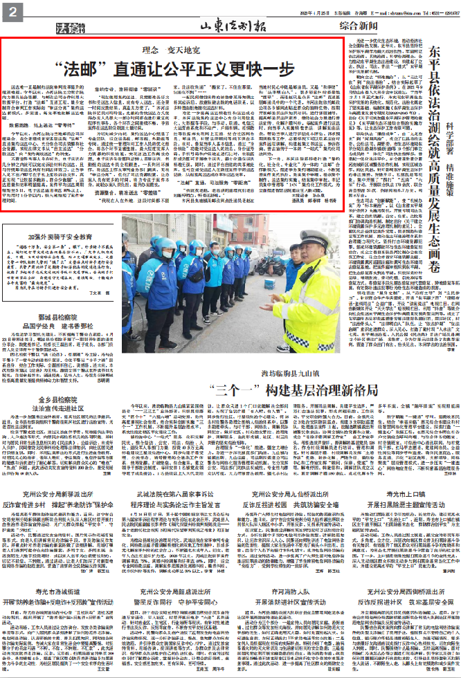 2023年4月25日,《山东法制报》2版头条《理念一变天地宽 “法邮”直通让公平正义更快一步》报道齐河县人民法院集约送达中心创新工作亮点。