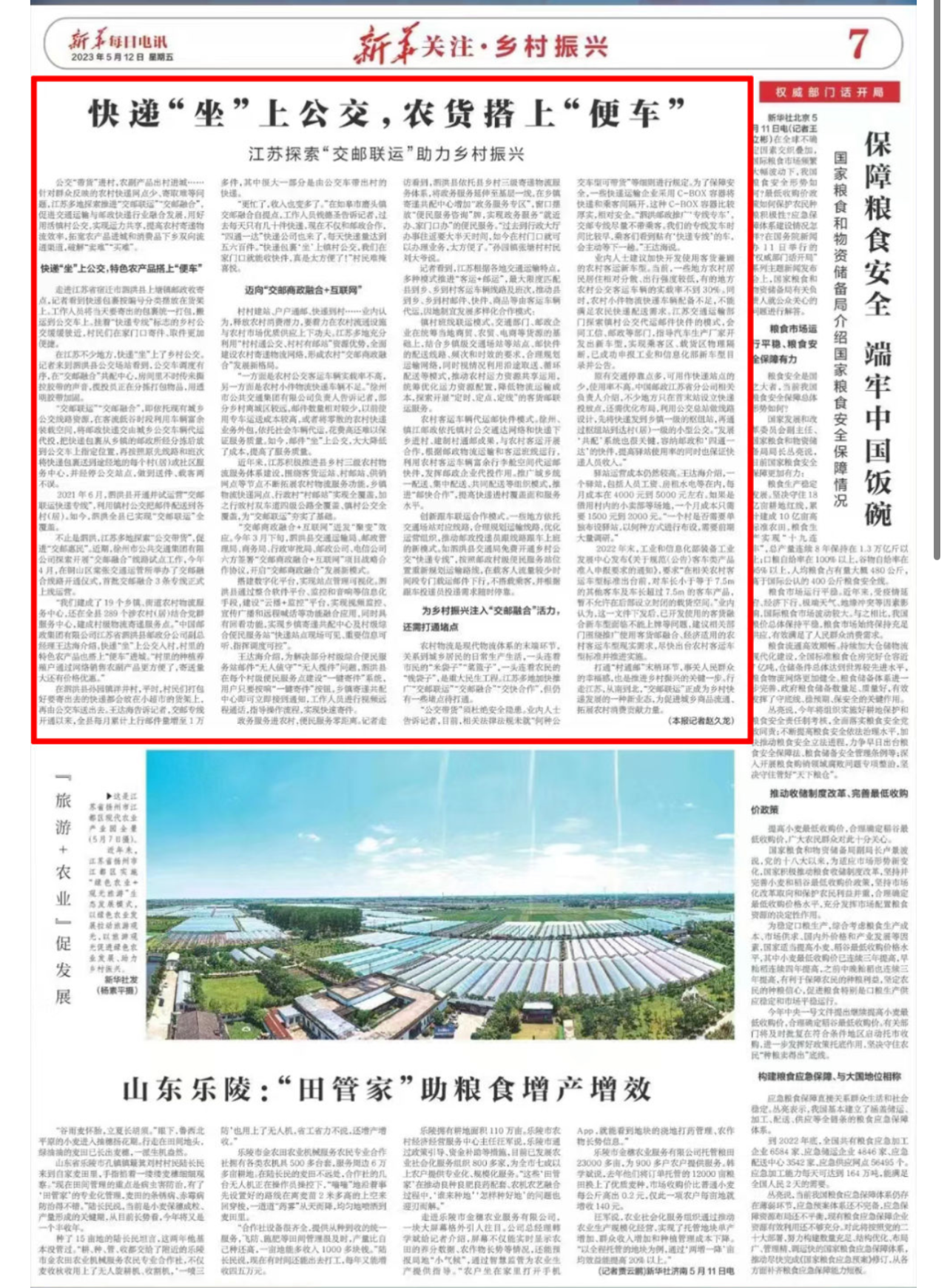 公交“带货”进村,农副产品出村进城……针对群众反映的农村快递网点少、寄取难等问题,江苏多地探索推进“交邮联运”“交邮融合”,促进交通运输与邮政快递行业融合发展,用好用活镇村公交,实现运力共享,提高农村寄递物流效率,拓宽农产品进城和消费品下乡双向流通渠道,破解“卖难”“买难”。
