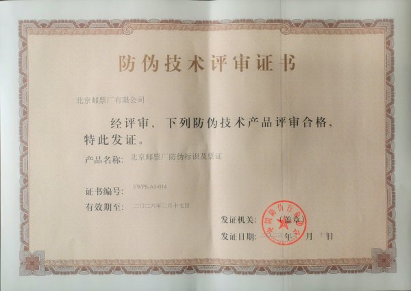 2023年3月15日,中国防伪行业协会在北京组织召开防伪技术专家评审会,评审专家对北京邮票厂有限公司印制的《庚子年》《中国飞机(三)》《国家公园》《第42届全国最佳邮票评选纪念》等邮品给予“防伪界艺术品”的美称。