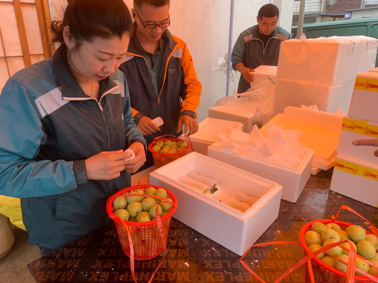 服务提档升级。分公司开设VIP绿色专线通道,每日揽收完成后直接运至长三角处理中心,全程冷链运输,进一步确保醉李的新鲜和口感。使用橙色“EMS极速鲜”胶带作为生鲜类快递提醒,同时设置客服小组全程把控寄递质量,确保果农安心放心。