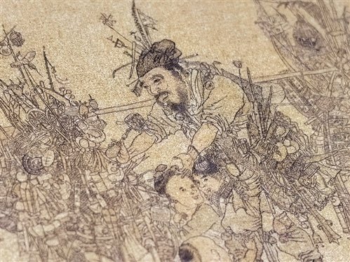 《货郎图》是南宋画家李嵩创作的一幅淡色横卷画,捕捉了货郎来到村口的一刹那,老幼妇孺无比喜悦的心情,琳琅满目的货品和热闹的场面朴素而感人。画中的人物及场景,完全依靠线条塑造,笔致工细,画法写实。要在方寸之间重现这一经典作品的神韵,主要依靠雕刻师的布线,通过激光直雕机高度还原精细的雕刻线条,从而赋予《货郎图》邮票生机。