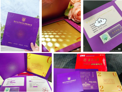 南京分公司为南京大学研究生院制作2023年研究生录取通知书8500套,典雅庄重的紫色,寓意南京大学厚重的历史文化;独特的方形外壳,寓意南大之本,赓续百廿;镂空设计之下的内页圆形,寓意勇攀高峰,敢为人先。录取通知书内置奋进南雍的个性化邮票,内页沿中线撕开后分别为入学纪念卡与录取通知书,入学纪念卡可自行保存留念。