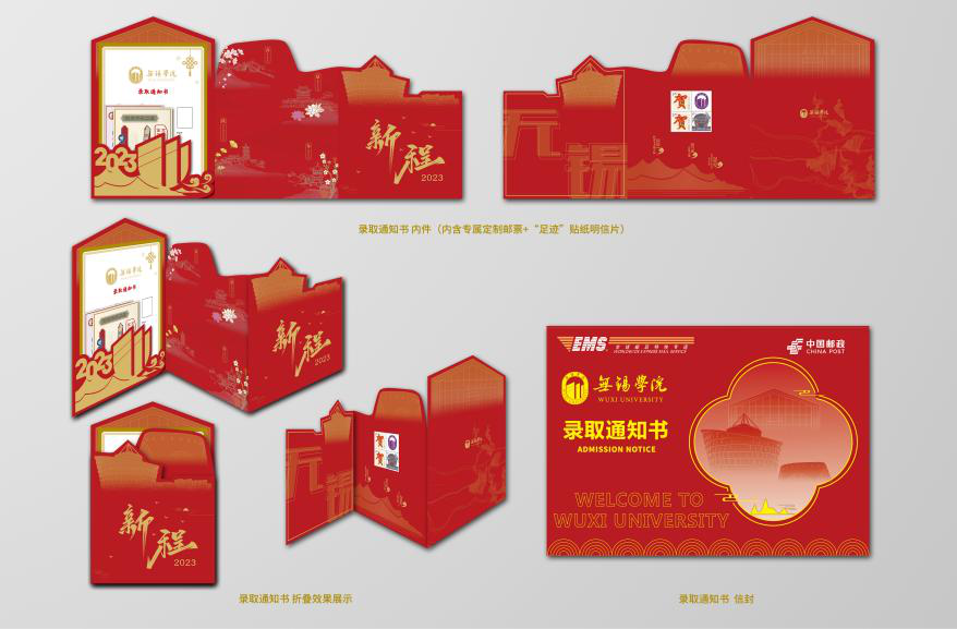 无锡分公司为无锡学院开发了主题为《新程2023》的录取通知书3350套,包含EMS定制封套1个和邮折1册(内含以“贺”为主图的定制个性化邮票2枚、贴纸明信片2枚)。