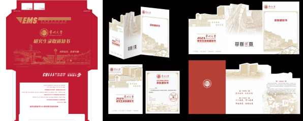 常州分公司为常州大学开发了研究生录取通知书3000套,包含个性化EMS封套+录取通知书内件,封套以红色、金色为主色调,象征喜庆高贵,寓意金榜题名。内件异形设计,勾勒出层叠的校园风光,展现学校发展历程、校训、办学理念等。