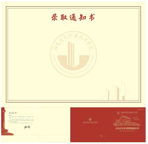 徐州分公司为江苏建筑职业技术学院开发2023年录取通知书5200封,以红色为基础色,并将校徽图案浅印在内页,内附校长寄语、签名。