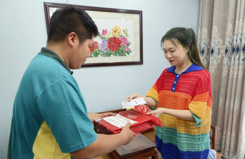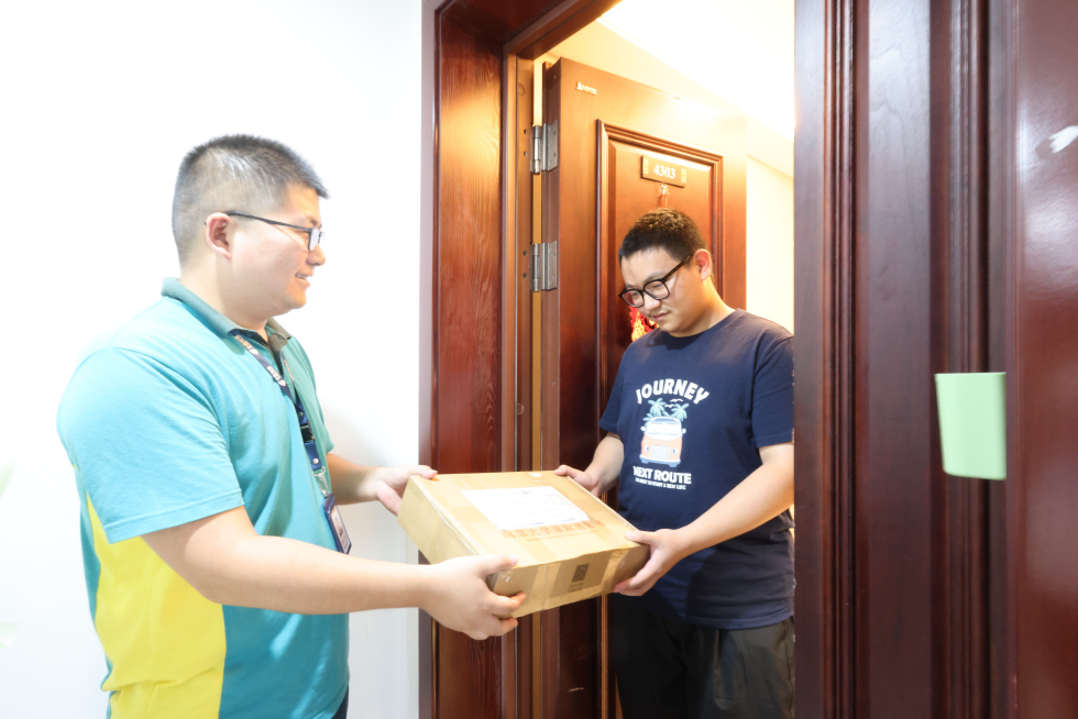 7月15日,投递员丁少波核实信息后,将江苏海洋大学的录取通知书、祝福鲜花、“带着文明上大学”邮政定制明信片等,一同送至施同学手中。