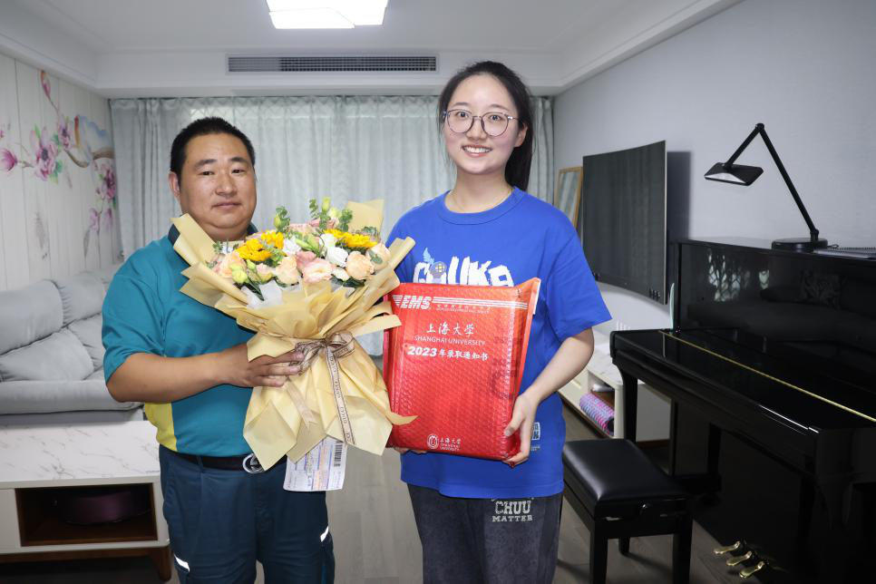7月12日,投递员蔡运带着上海大学的高考录取通知书,敲开了蔡同学的家门,核实信息后,递上通知书和鲜花,表示祝贺。