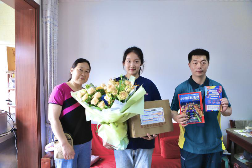 7月16日,投递员朱云平核实信息后,将南京大学录取通知书送到徐同学手中,随同送达的还有《中国国家地理》考生专刊。