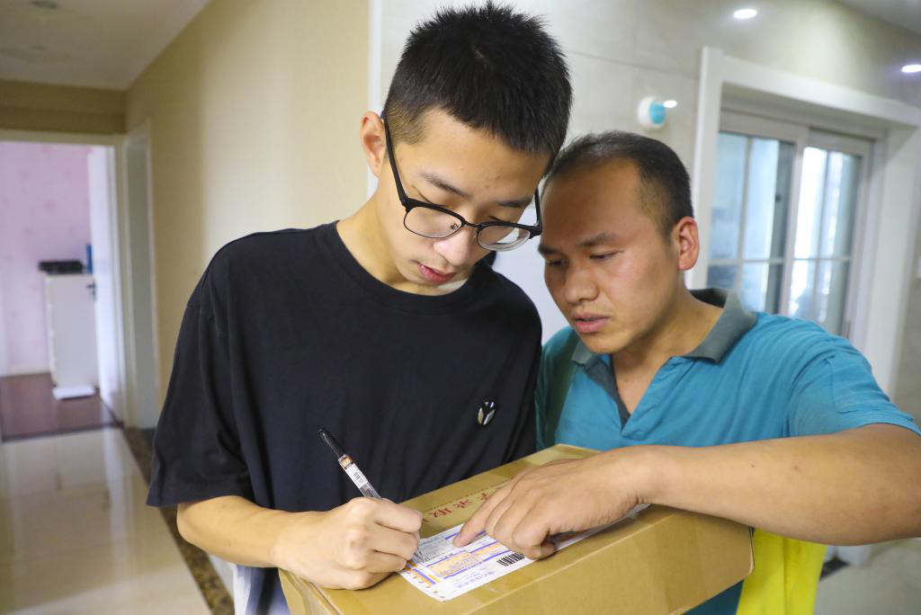 7月15日,投递员韦啸核实信息后,将同济大学的高考录取通知书第一时间送到戴同学手中。