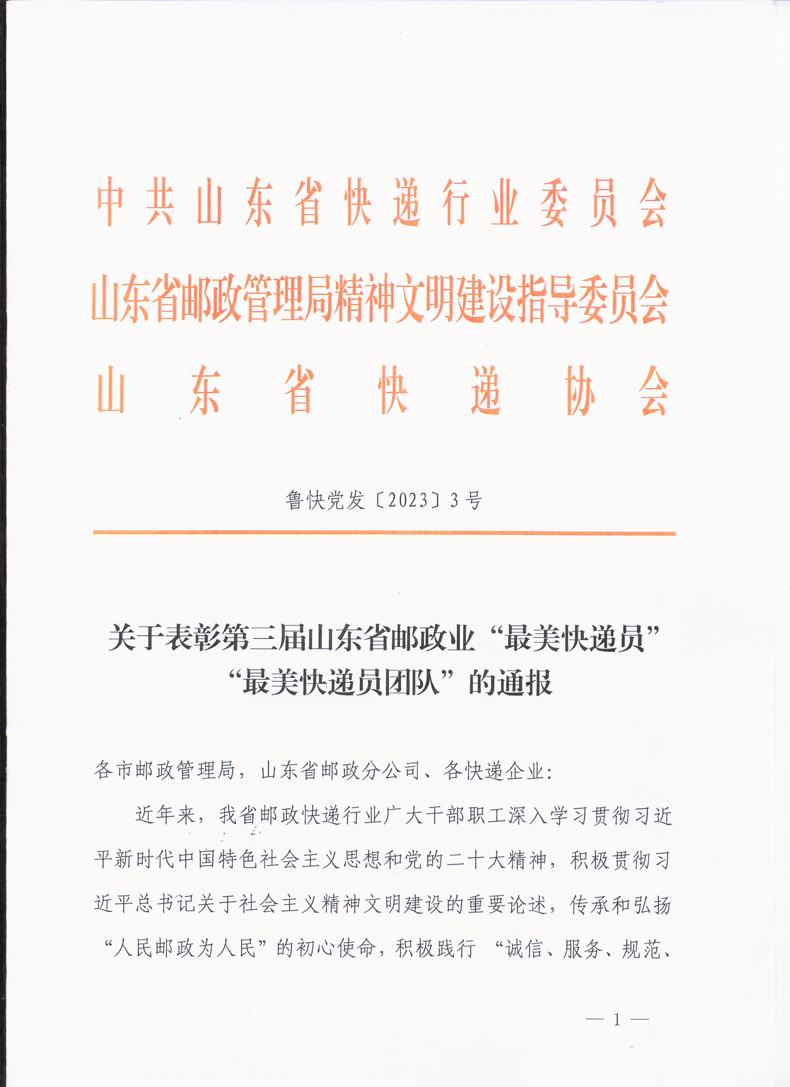 近日,第三届山东省邮政业“最美快递员”“最美快递员团队”评选活动揭晓,山东省邮政管理局精神文明建设指导委员会、中共山东省快递行业委员会、山东省快递协会决定,授予于飞等18人第三届山东省邮政业“最美快递员”称号,授予山东顺丰速运有限公司德州市黄河涯镇营业部等5个团队为第三届山东省邮政业“最美快递员团队”称号。