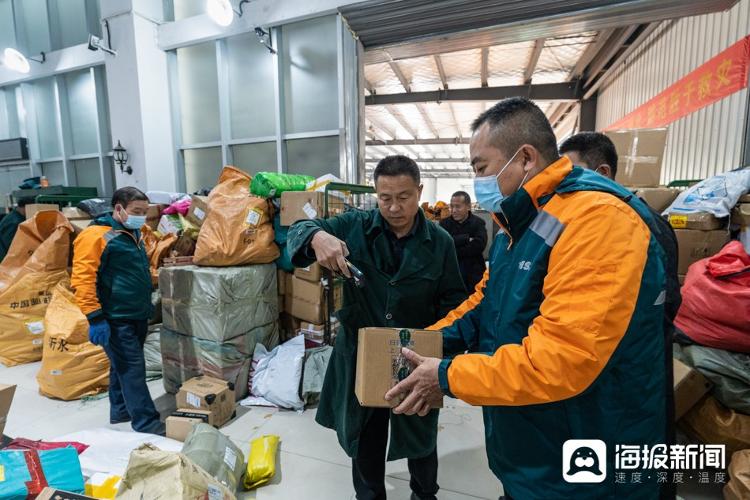 在中国邮政临沂市蒙阴县寄递事业部,工作人员正在分拣、扫描从湖南寄往蒙阴县麻峪村的快递(海报新闻记者 毕胜 摄)