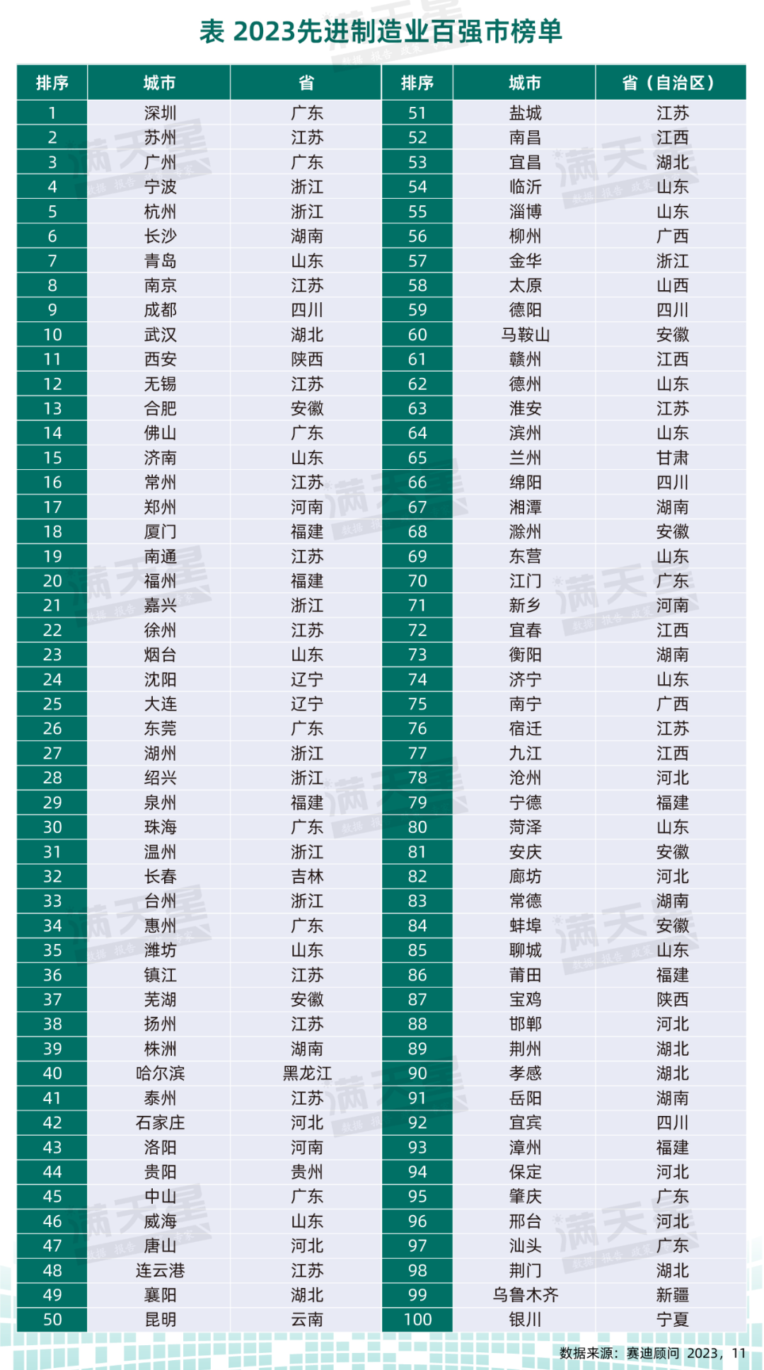 先进制造业是构建现代产业体系、培育发展新动能、助推经济高质量发展的重要手段,是城市能级和核心竞争力的重要体现。2023先进制造业百强市榜单从创新能力、融合发展、经济带动、品牌质量和绿色集约5个一级指标、24个二级指标,对全国293个地级市的先进制造业发展情况进行了系统研究和综合评估。
