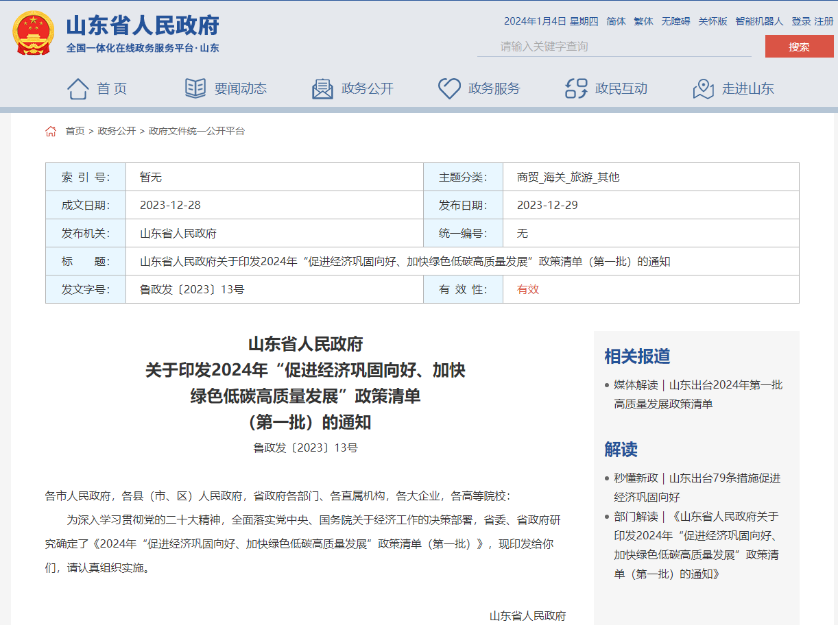 山东省人民政府关于印发2024年“促进经济巩固向好、加快绿色低碳高质量发展”政策清单(第一批)的通知
