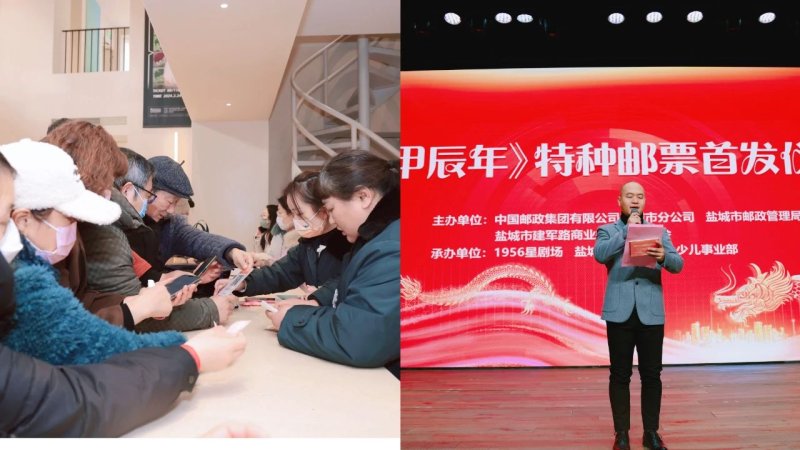 首发仪式在盐城电影院·1956星剧场隆重举办,活动吸引了约200名邮迷参加。除《甲辰年》生肖邮品发行外,活动还整合线上线下资源,线上邀约本地流量网红参与直播,线下邀请书法名家书写生肖龙年对联,为邮迷送上新春美好祝福。