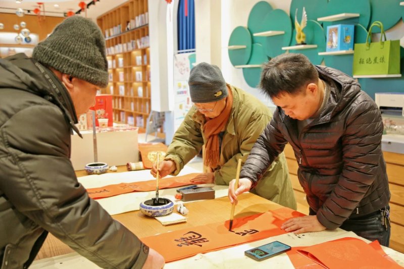 在邮政城市书房的一边,中国书法家协会会员们在红红火火的氛围中,铺纸研墨,现场提笔挥毫书写春联、“福”字。一个个饱含着浓浓年味、满载着新春祝福的文字跃然纸上,赢得了广大市民的喜爱和好评。当天共送出500余副对联和“福”字。