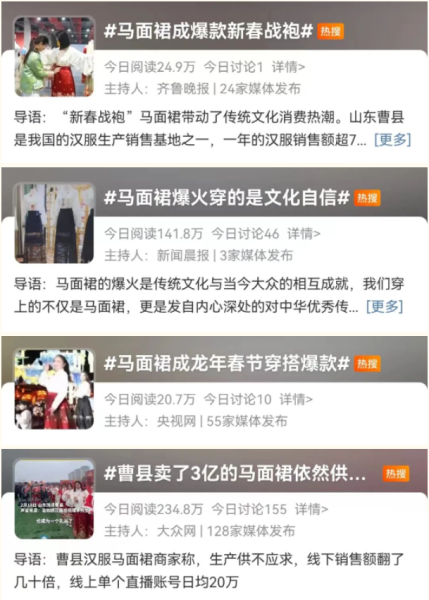 #马面裙爆火穿的是文化自信##曹县卖了3亿的马面裙依然供不应求#等相关话题更是火上热搜。马面裙到底有多火?光看评论区就能感受到那热辣滚烫。