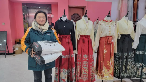 作为“新春战袍”,马面裙确实带动了一波传统文化消费热潮。山东曹县是我国汉服生产销售基地之一,一年的汉服销售额超70亿元。今年,在曹县,以马面裙为主的龙年拜年服销售额已经超过了3亿元。